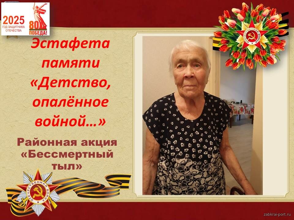 Ребенок войны, за нелегкое детство удостоенная юбилейных медалей, не серчает на судьбу, а радуется каждому прожитому дню. Ее окружают заботой и вниманием родные и близкие люди. Жизненной позицией Александры Витальевны остается только восхищаться, она до сих пор старается выполнять всю работу по дому, живо интересуется новостями и смотрит телевизор. Сама Александра Витальевна считает себя счастливым человеком, потому что несмотря на испытания, которые выпали на долю ее поколения, она нашла свое призвание и радость в работе и семье. А нам важно, когда так мало остается последних свидетелей той войны, принять эстафету памяти, услышать все это из первых уст и прикоснуться к пороху тех лет!