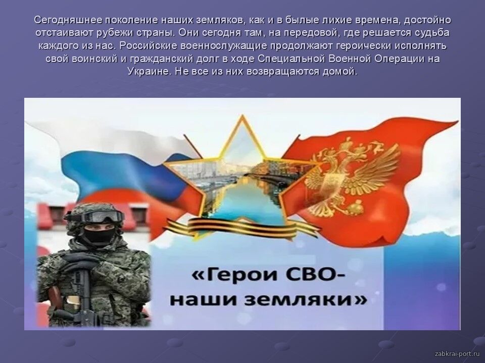 Проект также органично вписывается в концепцию Года защитника Отечества, расширяя понимание героического подвига от событий 1941-1945 годов до современных дней, подчеркивая преемственность воинской славы и уважение ко всем, кто стоял и стоит на страже Родины.
