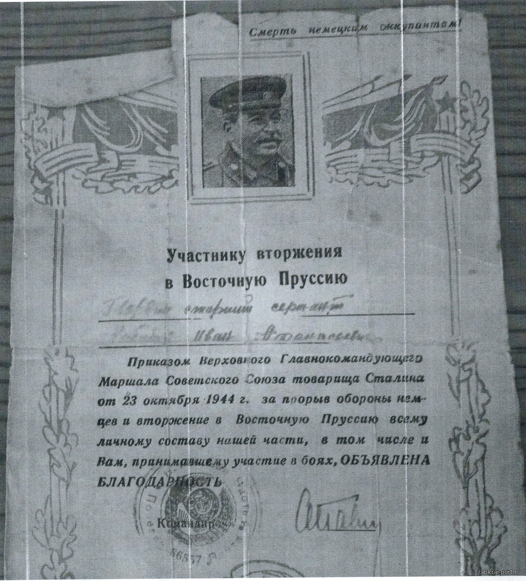 К счастью, пройдя трудными дорогами войны, один из немногих, Иван Афанасьевич вернулся в родное Забайкалье. Более 40 лет он честно и добросовестно трудился в совхозе «Шаранайский»-отделение «Олокой», затем в отделении «Хара-Бырка». Специальность фуражир, руководил заготовкой и распределением кормов для сельскохозяйственных животных. За свой безупречный труд, удостоен медали «Ветеран труда». Иван Афанасьевич по характеру был справедливым, честным и очень скромным человеком. Вырастилдвоих детей, принимал участие в воспитании внуков. Он не любил вспоминать войну, но к 40-летию Победы сделал исключение и написал в газету о своем фронтовом пути.