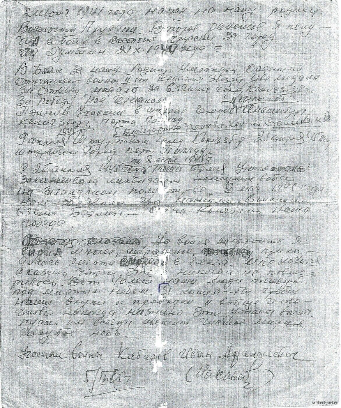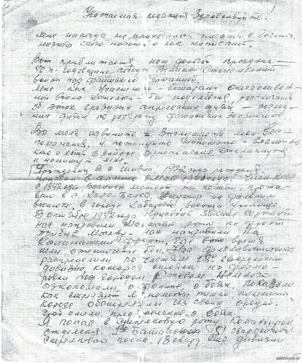 «Уважаемая редакция, здравствуйте! Мне никогда не приходилось писать в газеты. Не знаю с чего начать и как писать. Вот приближается наш дорогой праздник – 40-я годовщина Великой Отечественной Войны. Мне, как участнику- ветерану Отечественной войны, хотелось поделиться рассказом об этих грозных апрельских днях-последних днях разгрома фашистских захватчиков.